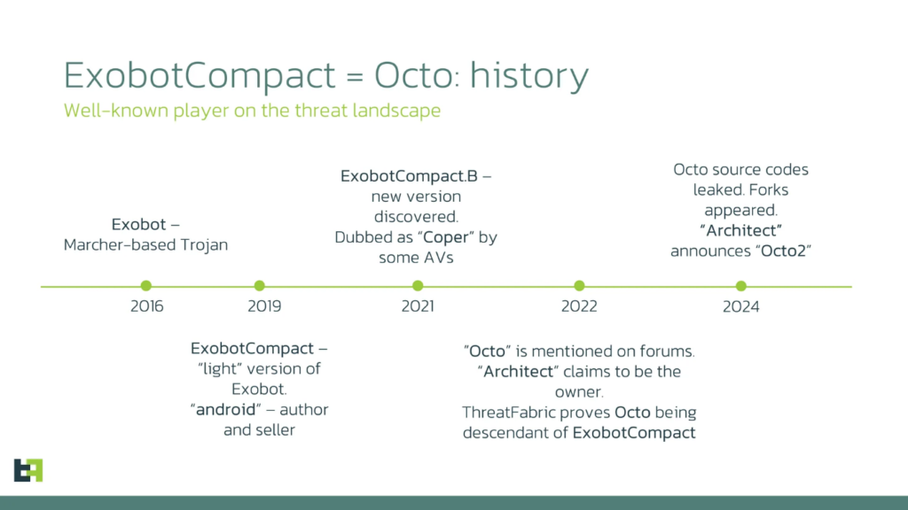 Additionally, in 2022, the first references to a cryptic mobile malware family named “Octo” surfaced on underground forums. An individual using the alias “Architect” claimed ownership of Octo but exhibited minimal engagement on the forums, revealing only scant information regarding the malware. ThreatFabric managed to piece together the information provided by the owner, confirming that Octo is merely a rebranded version of ExobotCompact.