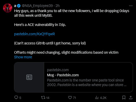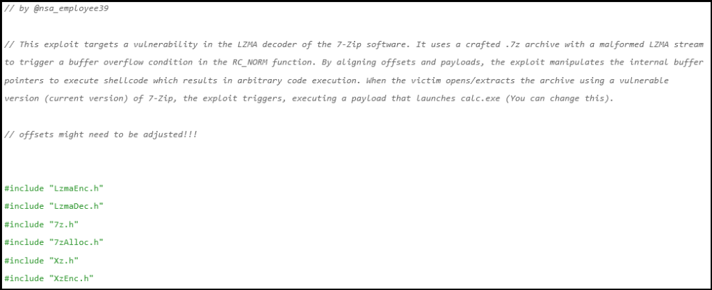 A hacker operating under the alias “NSA_Employee39” on X (formerly Twitter) recently disclosed a severe 7-Zip Zero-Day Exploit in the widely used 7-Zip file compression utility. This vulnerability enables attackers to execute arbitrary code on a victim’s machine when a malicious archive is opened or extracted using the latest version of 7-Zip. This revelation highlights the pressing need for cybersecurity vigilance as it presents significant risks to both individual users and enterprises, particularly in the context of Infostealer malware and supply chain attack vectors.
