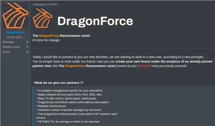 Recently, DragonForce rebranded itself as a “cartel,” signaling a strategic shift. Instead of a centralized brand, the cartel model allows affiliates to launch sub-brands under the DragonForce umbrella. These sub-brands can operate with customized names, logos, and affiliate terms while relying on DragonForce’s infrastructure for encryption, payment processing, and leak sites. This distributed approach offers affiliates greater autonomy and helps DragonForce evade disruption by diluting the visibility of any single brand.