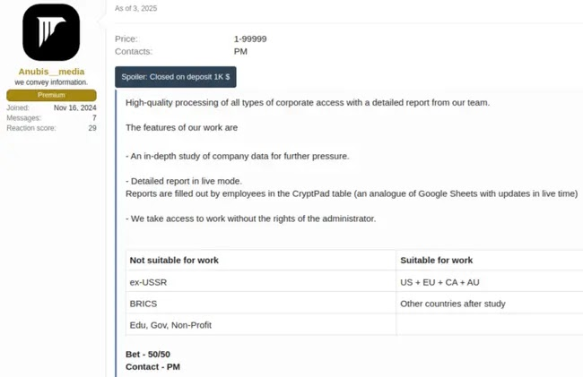 Anubis emerged on underground forums in late February 2025 with a novel recruitment pitch: three distinct extortion options, each with its profit-sharing ratio. By diversifying beyond straightforward encryption, Anubis appeals to a broader range of cyber criminals and complicates defensive planning.
