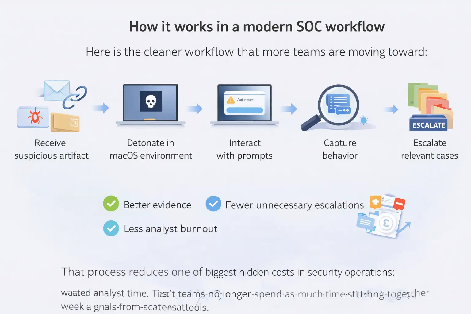 Before this style of workflow, a suspicious DMG or URL involving macOS might bounce between teams. Tier 1 sees a weak signal. A senior analyst spins up a separate test environment. The team waits. Meanwhile, the user may already have entered a password into a fake prompt or launched the second-stage payload. That is the expensive version of the story.