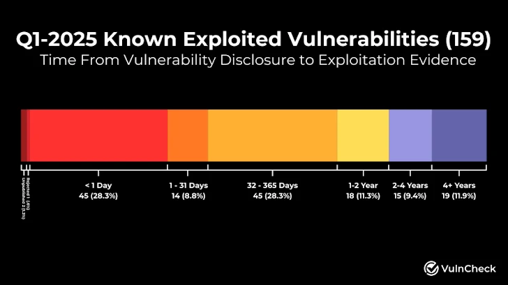 When a CVE goes public, vendors often race to issue patches—but attackers race even faster to reverse-engineer fixes and develop exploit code. The fact that nearly a third of all Q1 2025 CVEs were exploited within a single day highlights a critical “golden window” in which organizations remain highly vulnerable.