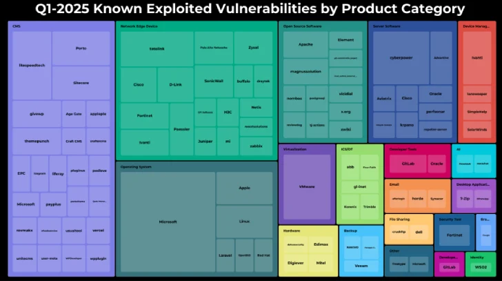 VulnCheck’s analysis groups the 159 exploited CVEs by the type of software they affect. The most heavily targeted categories in Q1 2025 were:
