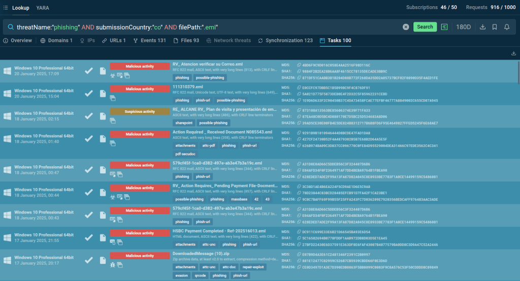 Threat Intelligence Lookup also facilitates tracking attacks targeting specific regions. For instance, to monitor phishing emails aimed at Colombian organizations, a query such as: