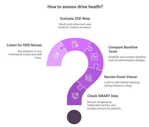 For HDDs, pay attention to new mechanical noises and excessive seek times.