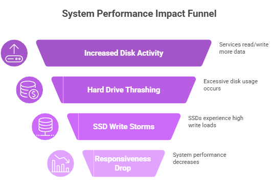Windows contains assistants that function in the background without you knowing. Indexing keeps searches quick. Superfetch and Prefetch try to figure out what you will open next. Telemetry gathers information about the system. After a big update, these workers typically wake up all at once and read or write more than they usually do. That causes more thrashing on a hard drive. On an SSD, it can look like write storms and a quick drop in responsiveness. This usually calms down, but if it doesn’t, it can seem like the update never ends.