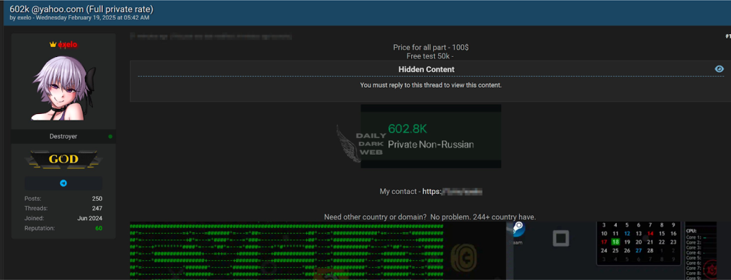 Recently, a hacker operating under the alias “exelo” stirred concern on an underground forum by advertising a database that allegedly contains 602,800 Yahoo email accounts. The advertisement claims that this dataset is both “private and non-Russian,” while the complete list is priced at $100; a free sample of 50,000 accounts is reportedly available to potential buyers as a test. In this blog, we explore the details of this alleged leak, provide historical context regarding Yahoo’s previous data breaches, discuss how such information might be exploited, and offer practical steps to safeguard your personal information in an increasingly risky online environment.